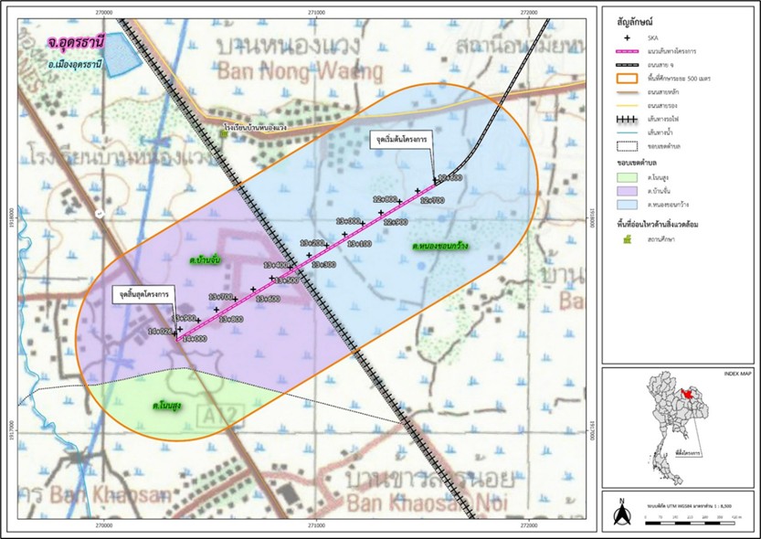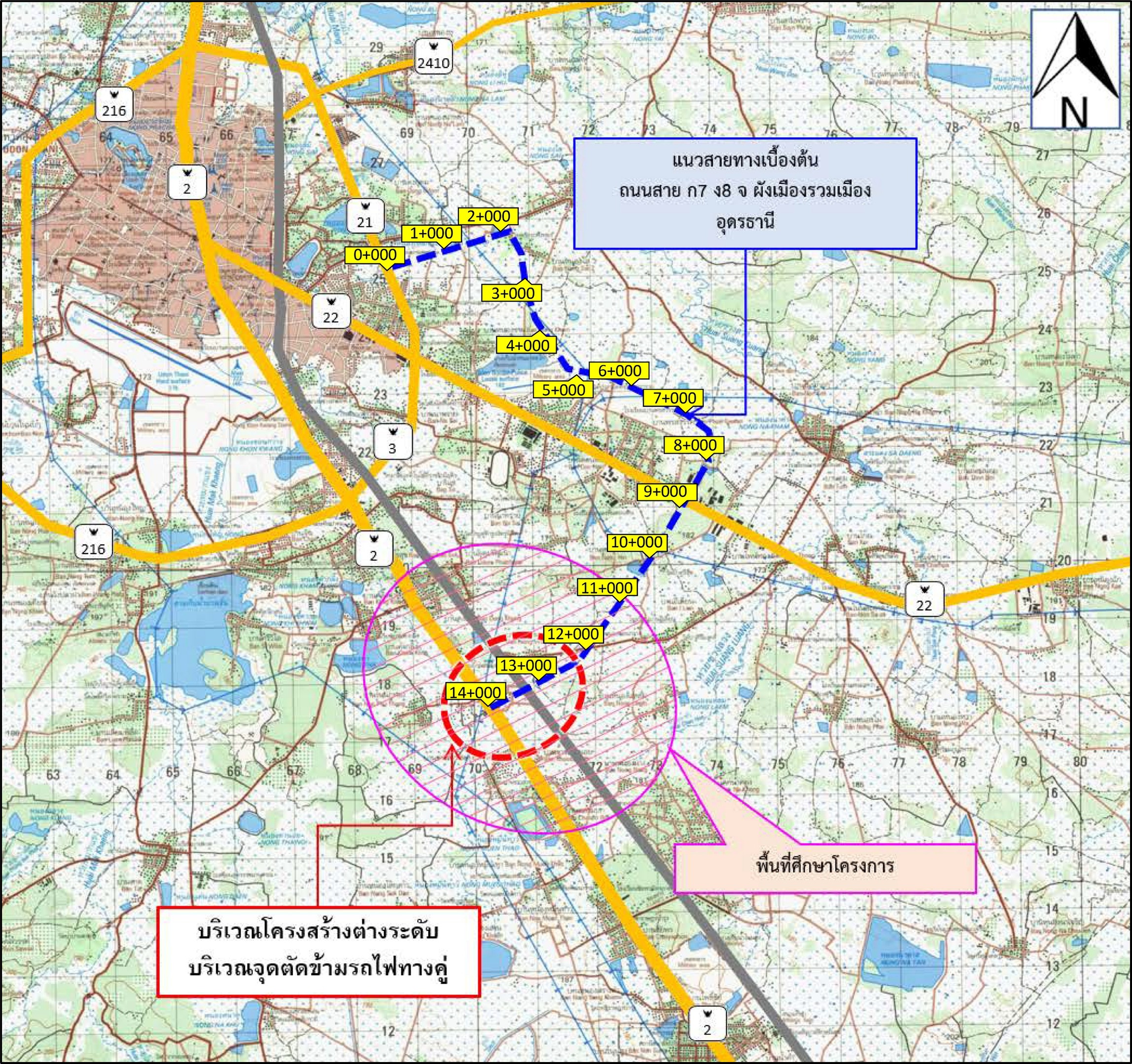 ของสะพานข้ามทางรถไฟทางคู่ กิโลเมตรที่ 13+800 จุดสิ้นสุดของสะพาน ความยาวของสะพาน ประมาณ 900 เมตร และกิโลเมตรที่ 14+026 จุดสิ้นสุดของโครงการ ซึ่งบรรจบกับทางหลวงแผ่นดินหมายเลข 2 ซึ่งโครงการสำรวจออกแบบโครงสร้างต่างระดับบริเวณจุดตัดข้ามรถไฟทางคู่บนถนนสาย จ ผังเมือง รวมเมืองอุดรธานี อ.เมืองอุดรธานี จ.อุดรธานี ใช้แนวเส้นทางตามแนวผังเมืองฯ ในการดำเนินงานสำรวจและออกแบบ รายละเอียดแสดงดังรูปที่ 1